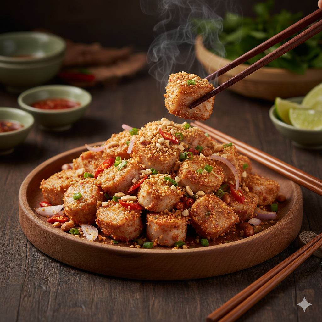 Cá tầm lắc muối tôm là món ăn mang hơi thở hiện đại nhưng vẫn giữ trọn vị ngon tự nhiên của cá tầm. Cá được cắt miếng vừa ăn, chiên hoặc áp chảo cho lớp ngoài vàng nhẹ, bên trong vẫn giữ độ dai béo đặc trưng. Khi còn nóng, cá được lắc đều cùng muối tôm dậy mùi, vị mặn – cay – ngọt cân bằng, bám đều từng thớ cá. Món ăn hấp dẫn từ hương thơm đến màu sắc, ăn một miếng là cảm nhận rõ vị đậm đà lan nhanh, rất “bắt vị” nhưng không hề ngấy.