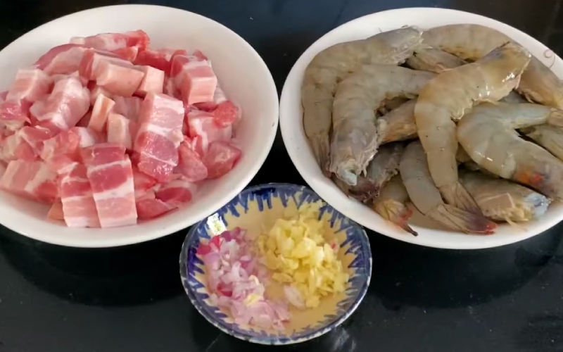 Tôm tươi, thịt ba chỉ, hành khô, tỏi, ớt, nước mắm, đường, gia vị nêm nếm